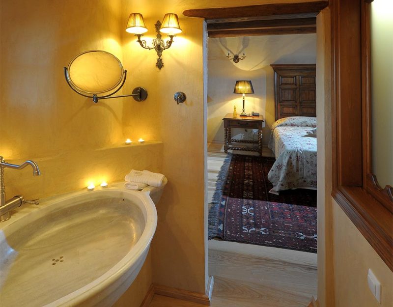 The suite features two rooms. The bedroom is elegantly decorated with antiques and Kourtis furniture, including a wooden mirror, a king size bed, wooden ceiling, a handmade rug and romantic lamps that create a unique sense of warmth. The marble bathroom just completes the perfect aesthetics of the luxury suite, in this beautiful accommodation establishment of Pelion, in Greece.