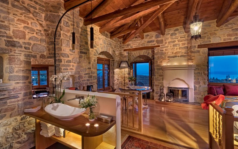The suite features two rooms. The bedroom is elegantly decorated with antiques and Kourtis furniture, including a wooden mirror, a king size bed, wooden ceiling, a handmade rug and romantic lamps that create a unique sense of warmth. The marble bathroom just completes the perfect aesthetics of the luxury suite, in this beautiful accommodation establishment of Pelion, in Greece.